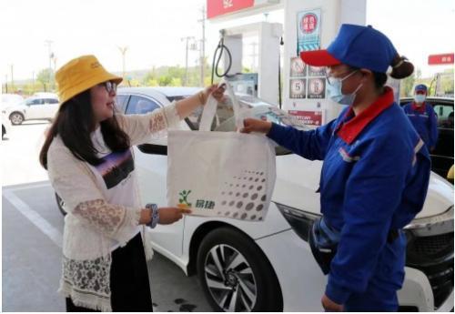 圖為中國石化青海石油分公司的加油站員工向客戶贈(zèng)送環(huán)保購物袋